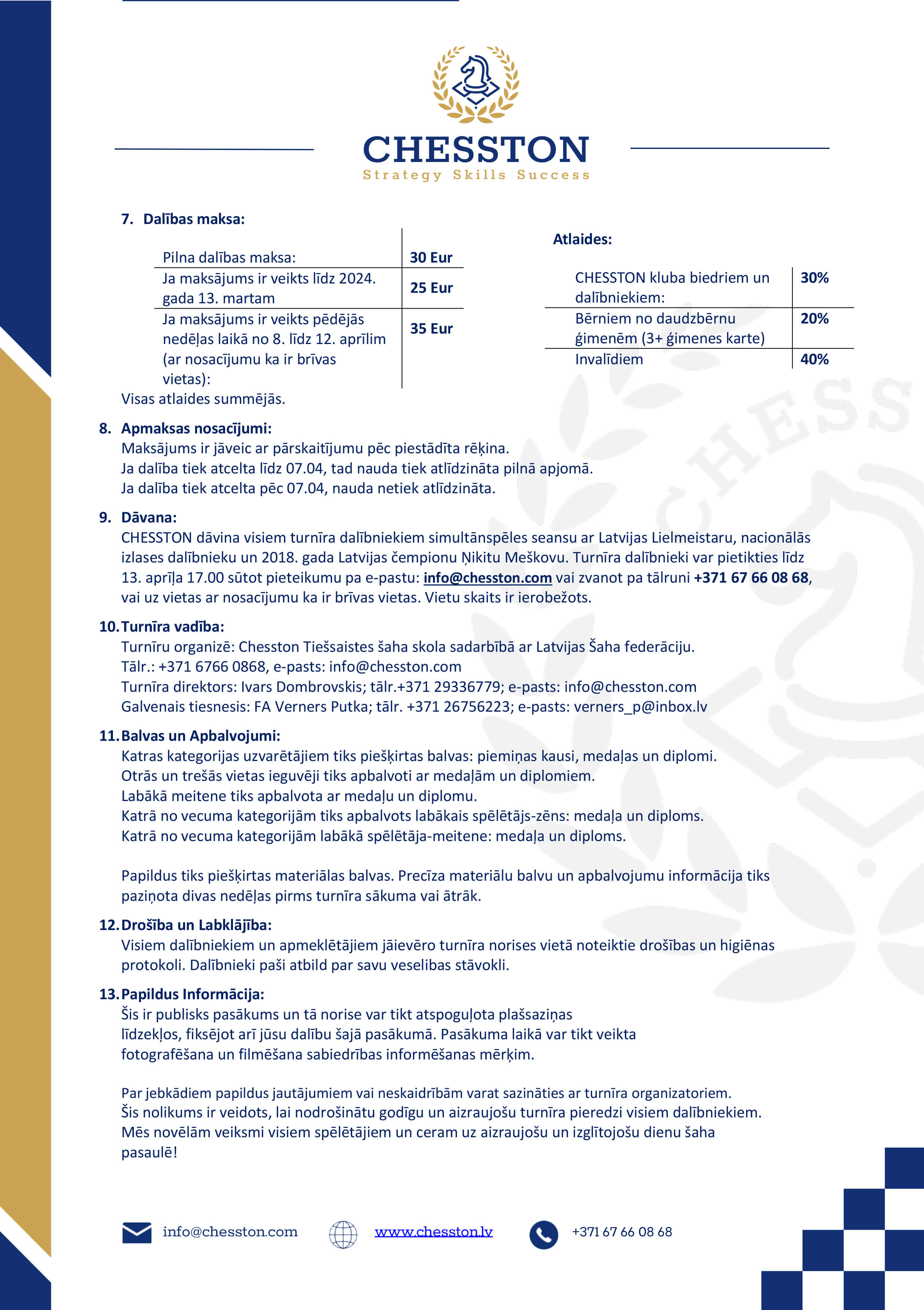 Pieteikums jāiesniedz aizpildot formu šajā lapā vai sūtot pieteikumu pa e-pastu: info@chesston.com, norādot dalībnieka: